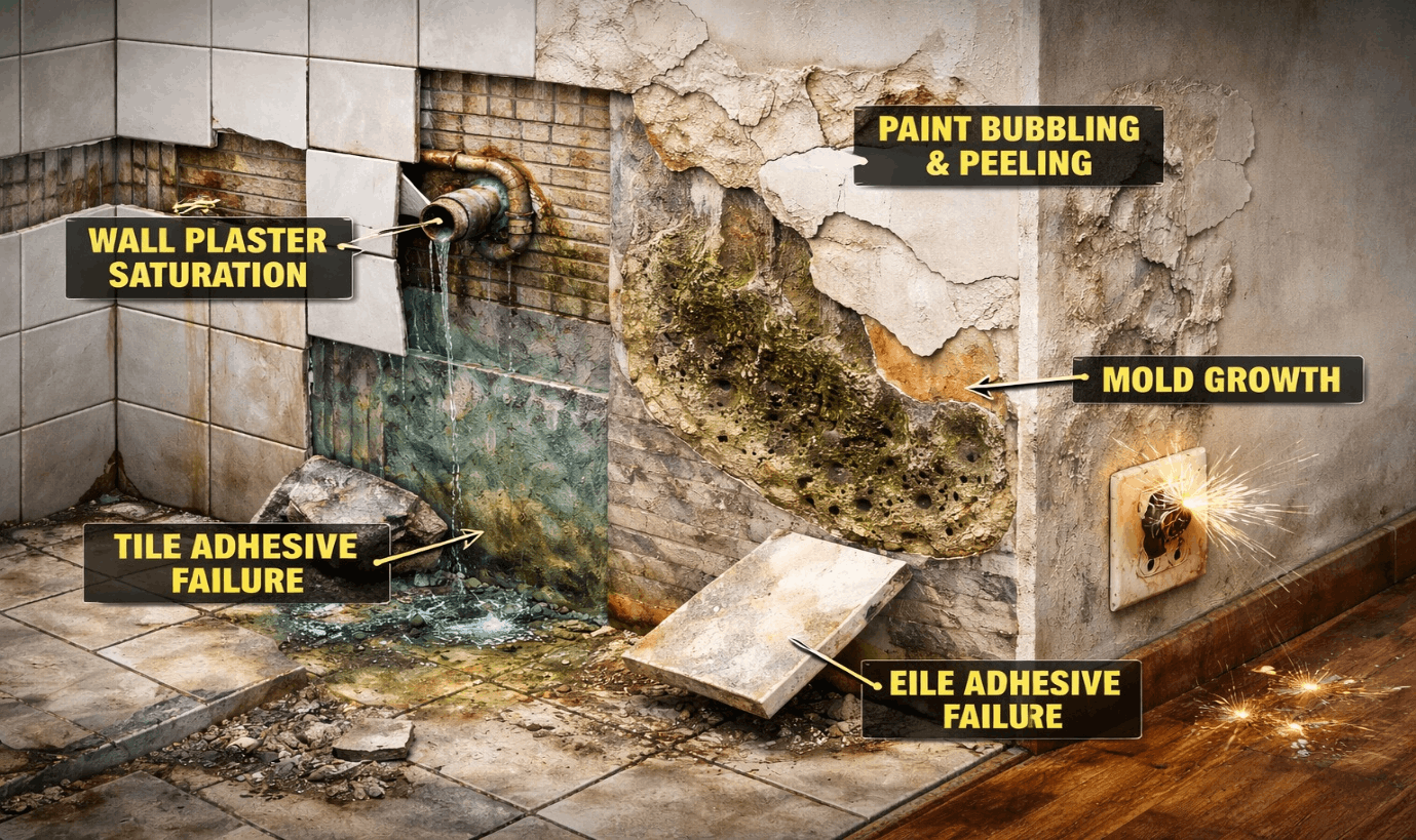 Behind your tiles, water may already be spreading silently — soaking into plaster, weakening structures, and damaging adjacent rooms. By the time visible damage appears, the internal destruction may already be serious.