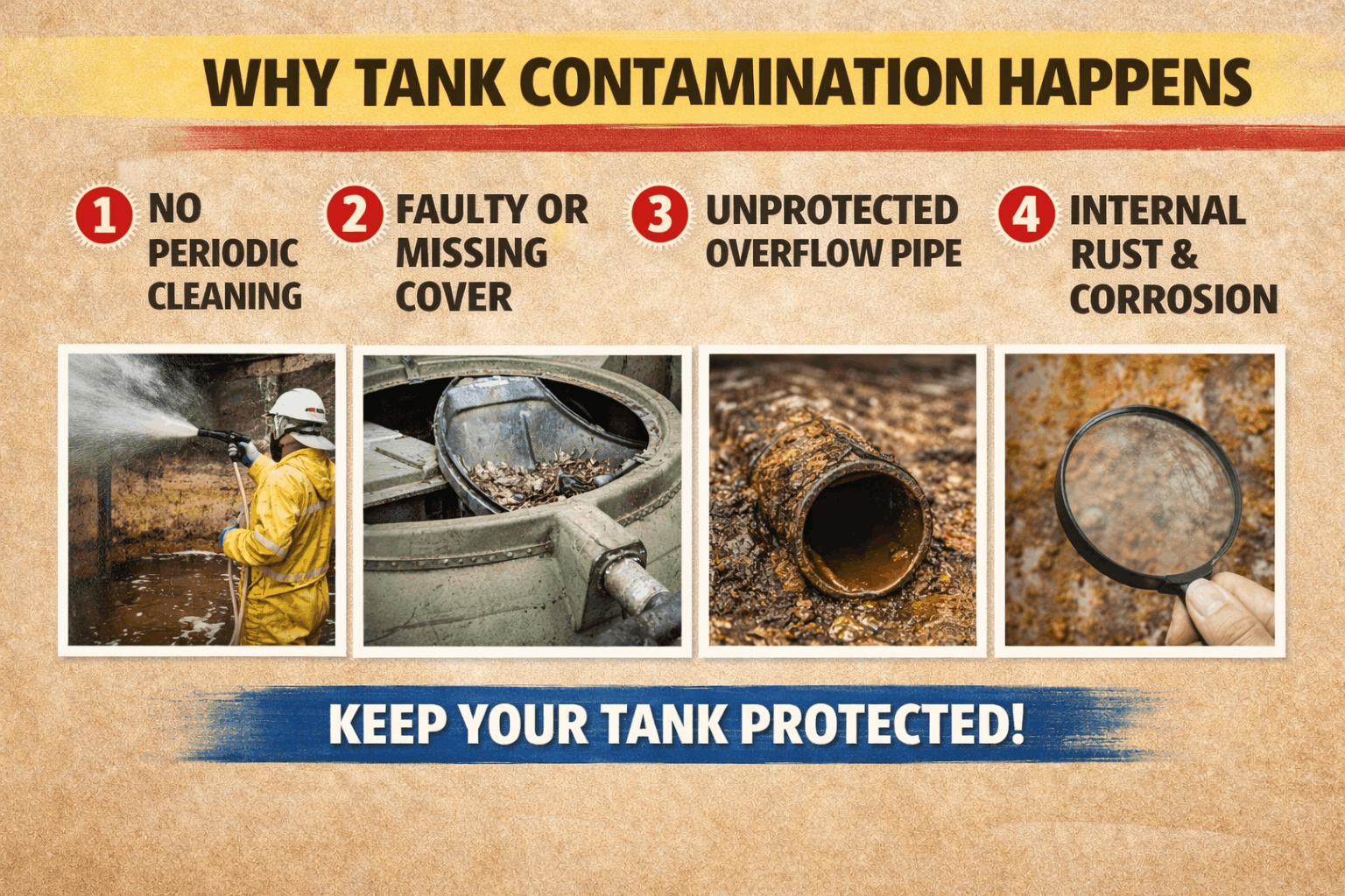 Tanks should be cleaned and disinfected at regular intervals. When this is skipped, sludge accumulates silently. - Faulty or missing covers