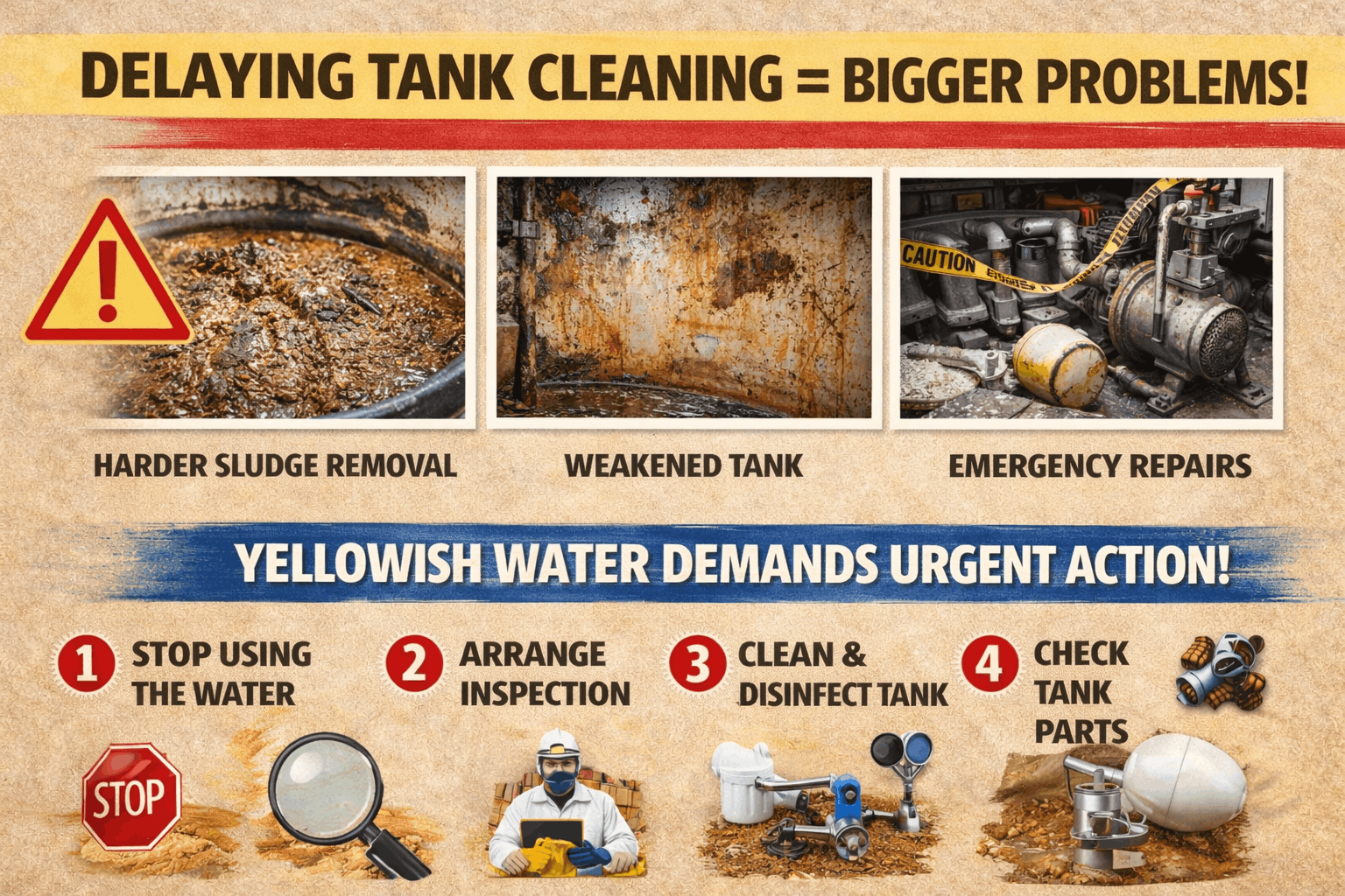 When water appears yellow, brown, or slightly rusty, it usually means contaminants are present. These contaminants do not appear overnight. They build up slowly inside the water storage tank and distribution system.