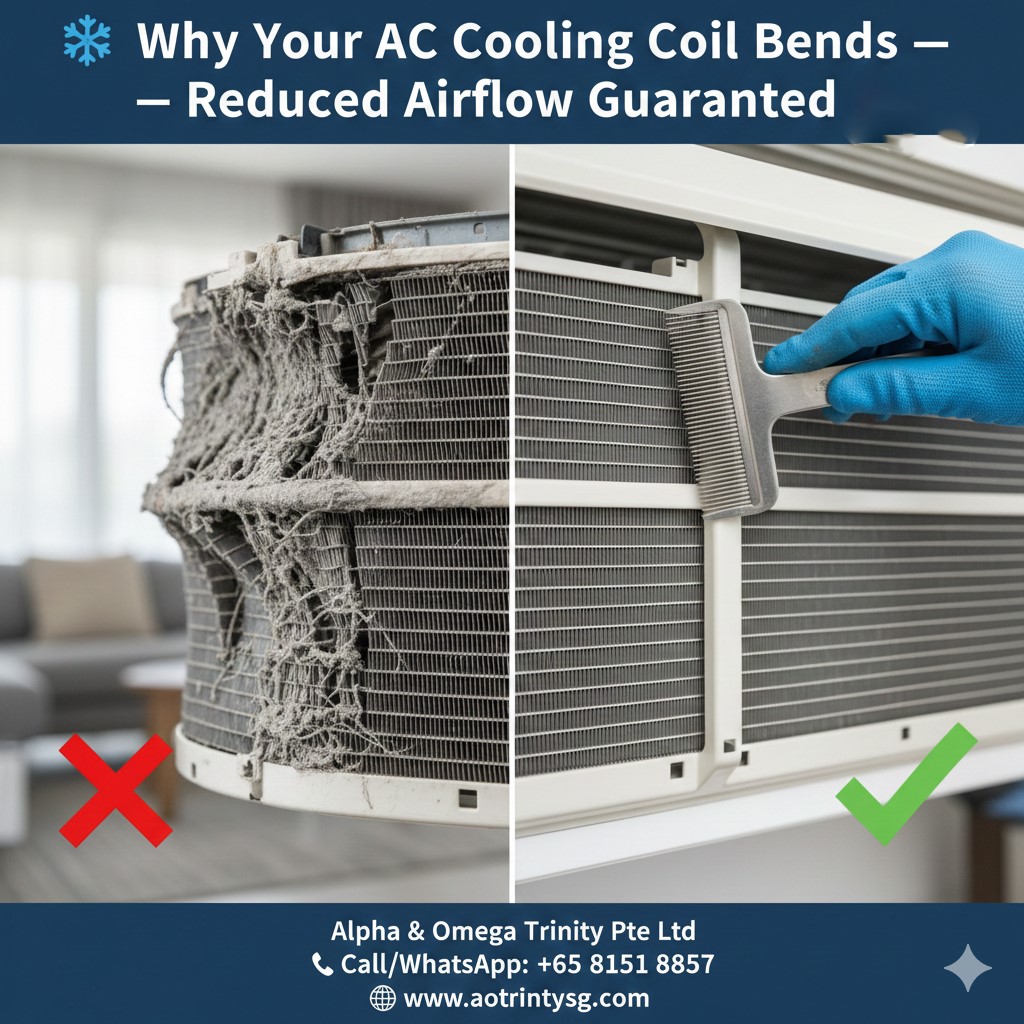 At Alpha & Omega Trinity Pte Ltd, we understand the critical importance of a healthy AC cooling coil and optimal airflow. Our experienced and trained technicians are equipped with the knowledge and tools to diagnose and resolve issues related to bent fins and restricted airflow. We are committed to restoring your AC's efficiency and your home's comfort.