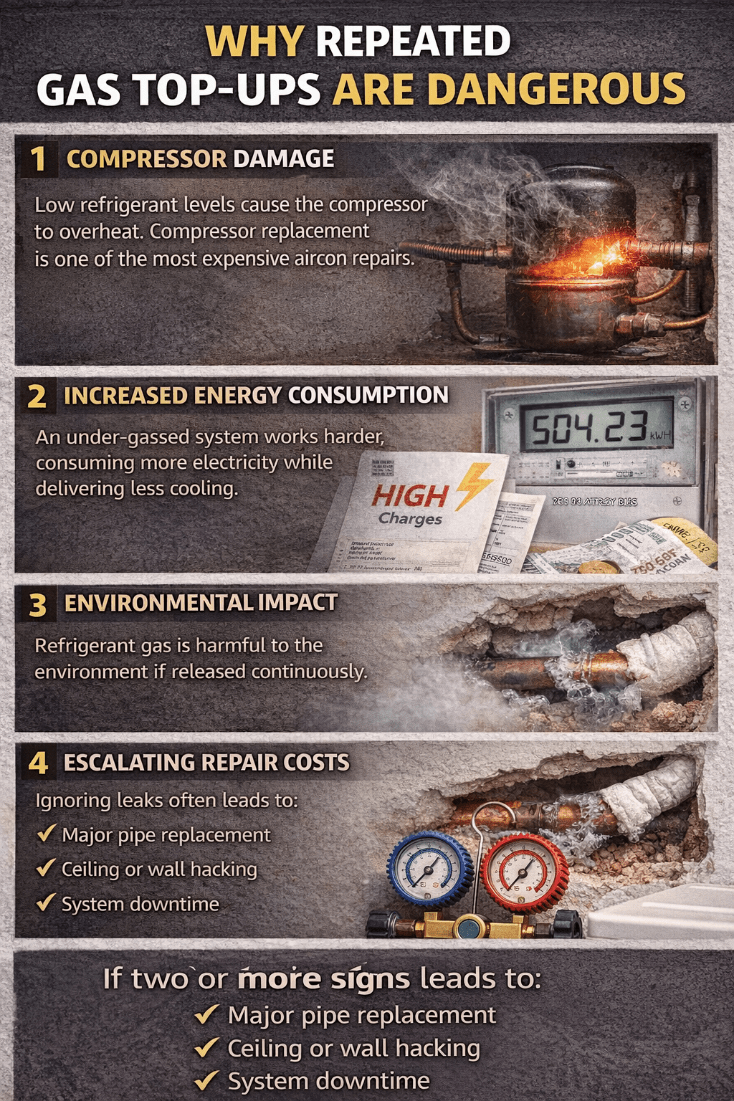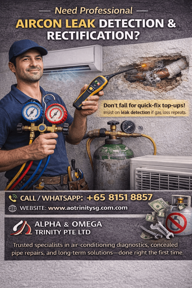 This blog explains why AC gas top-ups keep failing, how hidden leaks occur, the risks of ignoring them, and the correct long-term solution—especially relevant for Singapore homes, condos, offices, and commercial spaces where concealed piping is common.