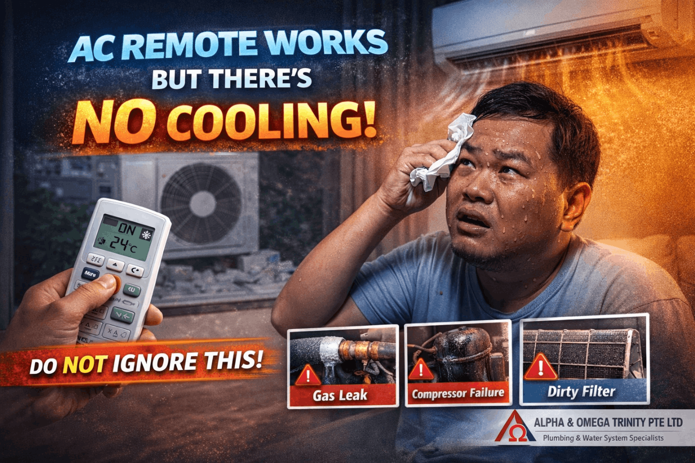 This is one of the most common complaints we receive at Alpha & Omega Trinity Pte Ltd. Many customers assume the air-conditioner is “working” because the remote responds and the fan runs. However, cooling depends on multiple internal components — not just the remote signal.