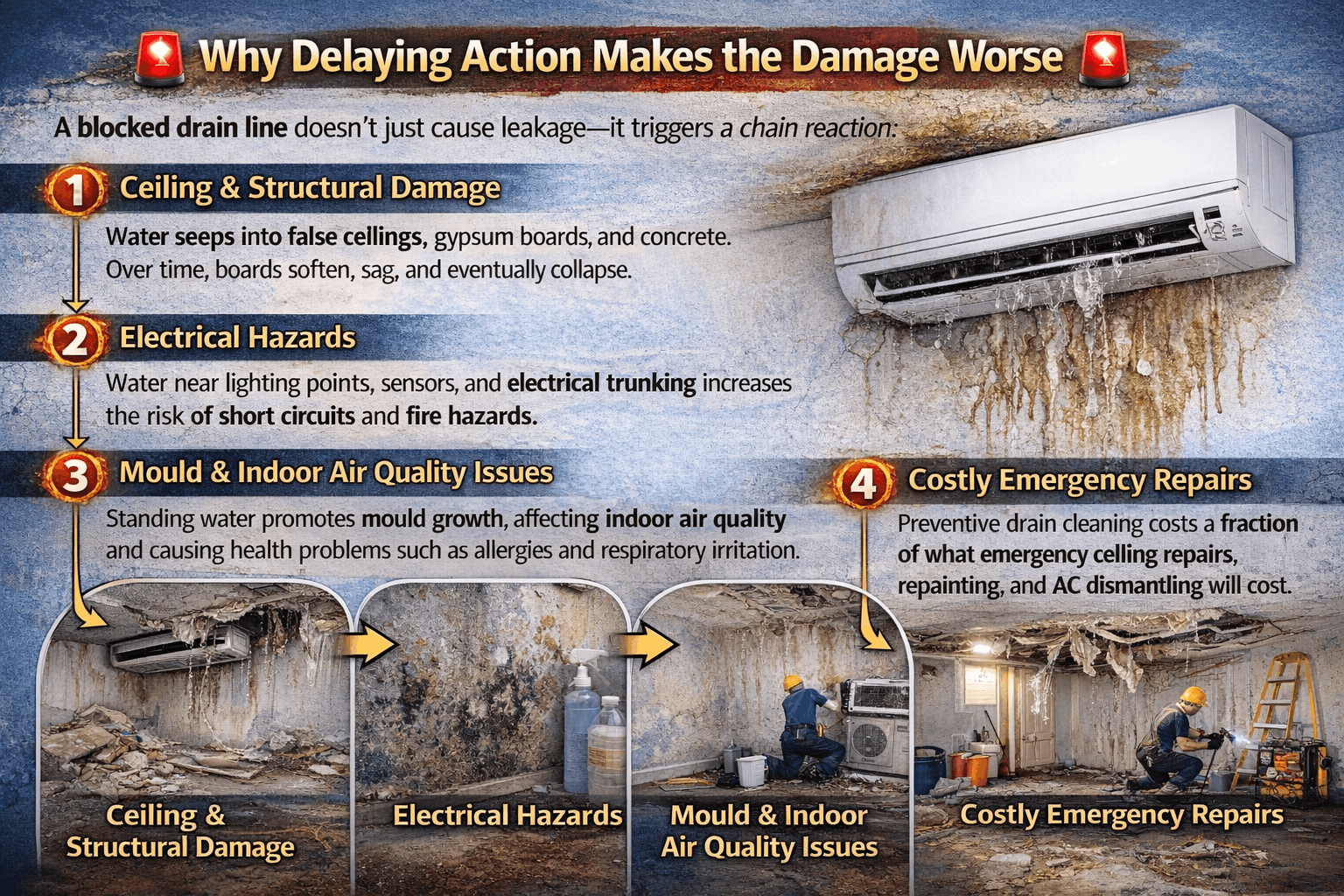 A choked AC drain line is one of the most common and most underestimated causes of water leakage in residential, commercial, and industrial buildings. Left unattended, it can lead to flooding, ceiling collapse, mould growth, electrical risks, and costly emergency repairs.